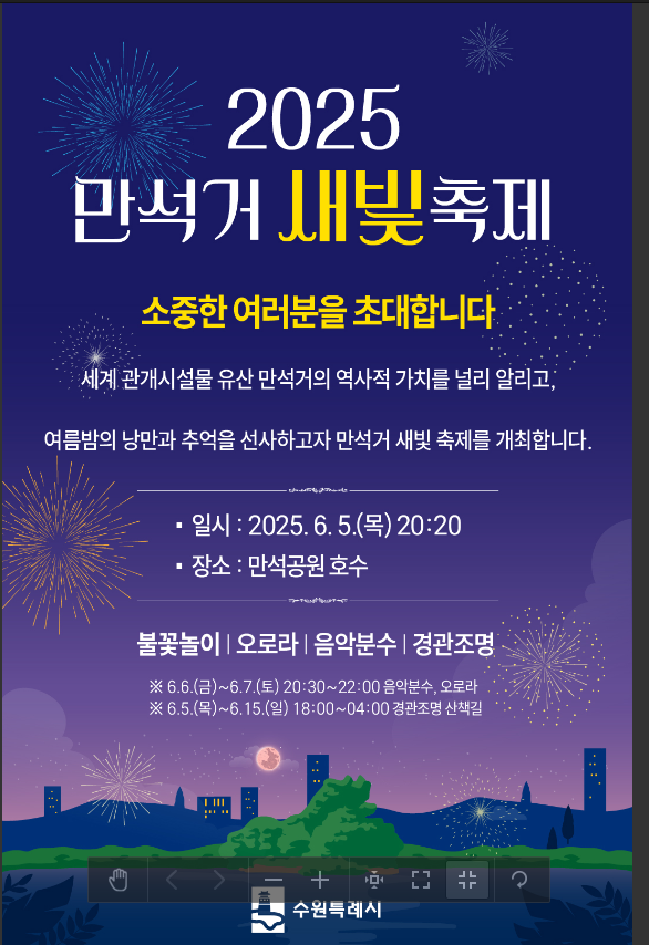 2025년 6월 5일부터 15일까지 경기도 수원시 장안구 만석공원 일대에서 진행되는 이번 축제는 작년에 이어 두 번째로 열리는 행사입니다. 이번 축제는 단순한 야경 조명을 넘어, 수원의 밤을 새롭게 경험하는 시간으로 기획되었습니다.