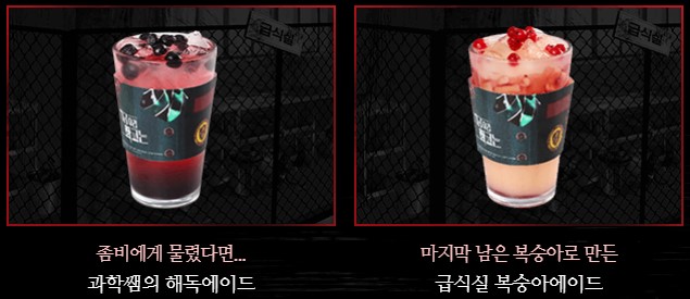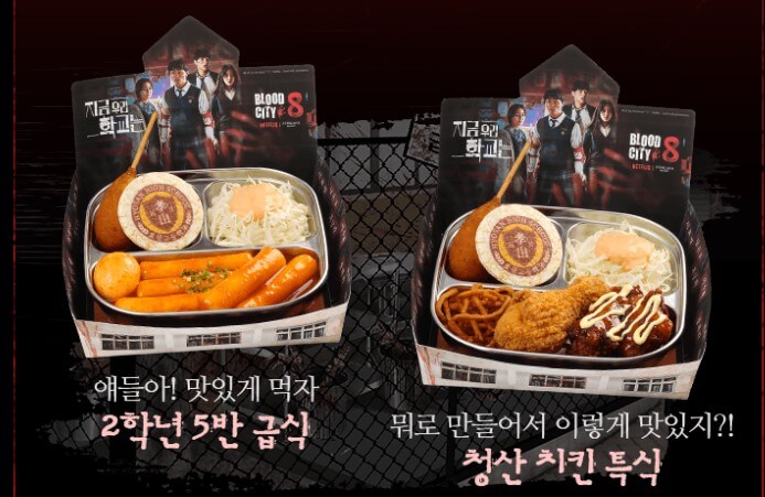 2학년 5반 급식, 청산 치킨 특식, 과학쌤의 해독에이드, 급식실 복숭아 에이드, 스리라차마요 치킨떡볶이, 치킨&철판김치볶음밥, 오다리&테바사치킨도리아, 좀비의 메론바 슬러쉬 8개의 메뉴가 있습니다.
